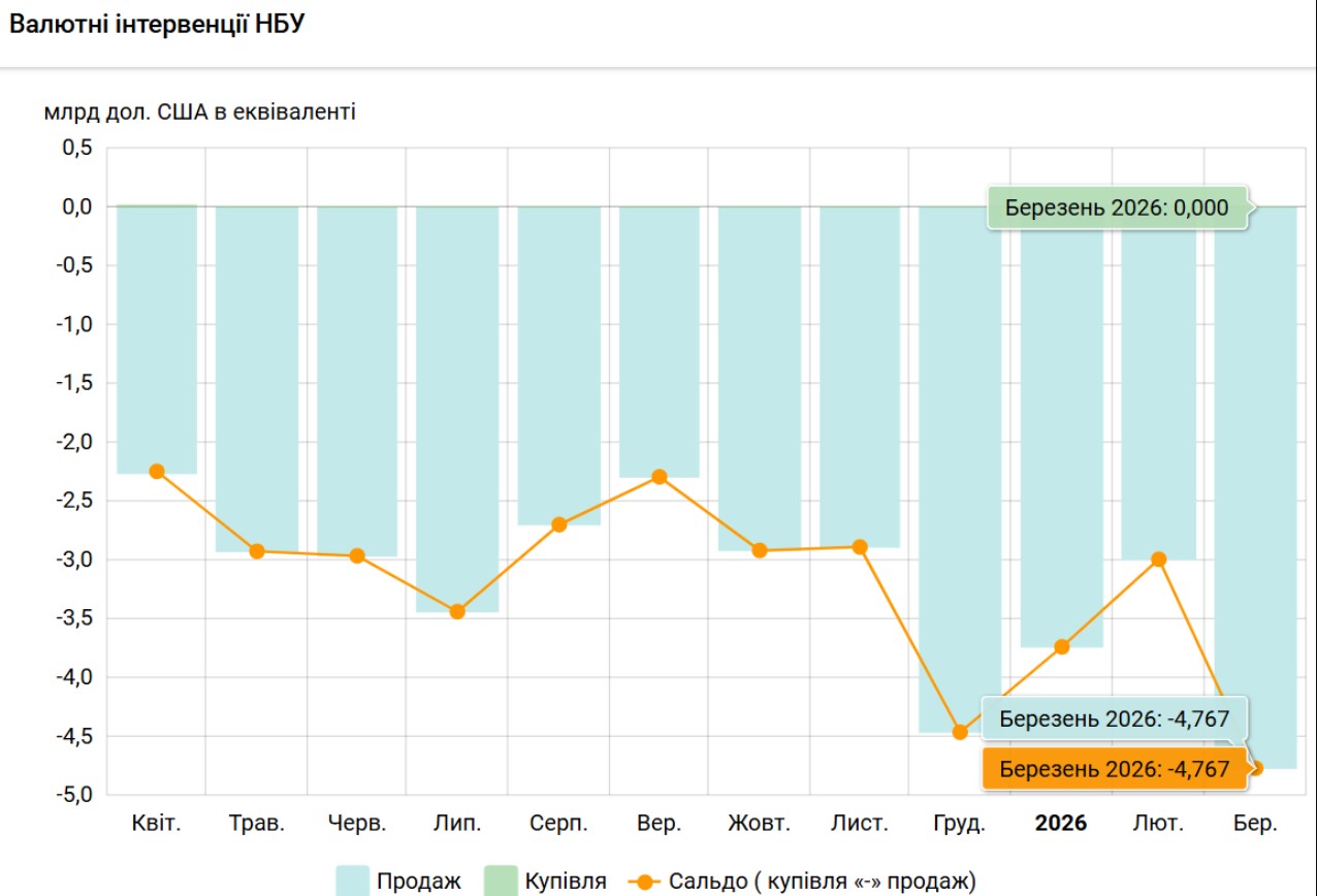 У підсумку, за березень 2026 року інтервенції Нацбанку для підтримки гривні на торгах склали антирекордні $4,767 млрд.