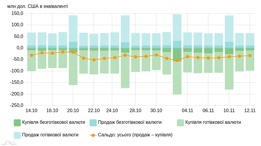 Щодо внутрішніх чинників, то цього тижня до негативу можна точно віднести корупційний скандал у вищих ешелонах влади, що вже призвів до відставки двох міністрів, і це явно лише початок. Крім того, проти гривні працюють: посилення обстрілів росією мирної інфраструктури України, тиск на фронтах, зростання попиту на валюту з боку бізнесу і громадян на тлі наближення виходу на ринок бюджетної гривні перед закінченням року.