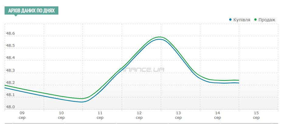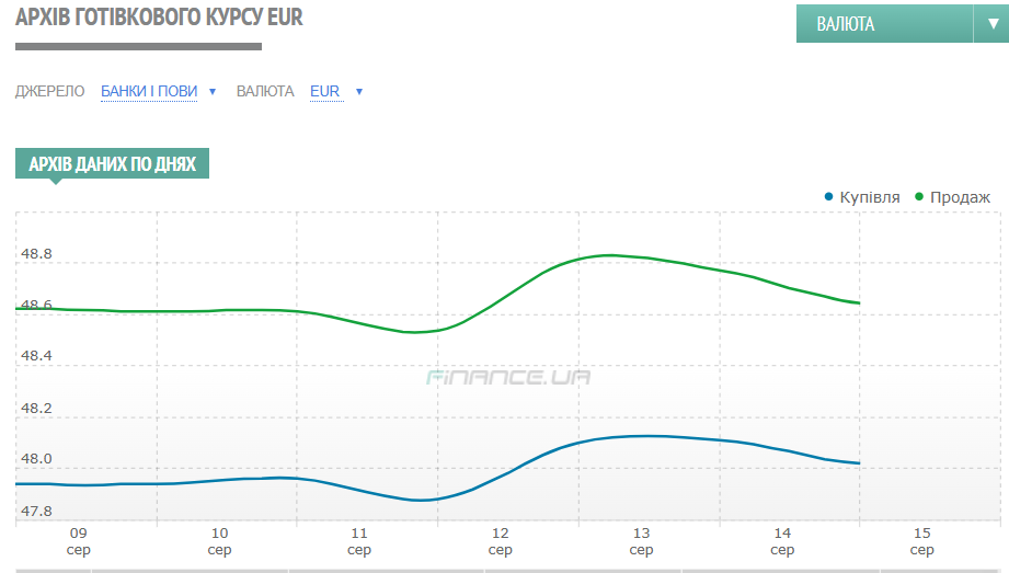 А курс продажу євровалюти за цей період знизився на 7 копійок — з 48,3089/48,3314 до 48,2363/48,2590 гривень. Готівковий євро в обмінках фінкомпаній увечері в п'ятницю, 15 серпня, можна було без проблем купити в межах 48,50 — 48,70 гривень.