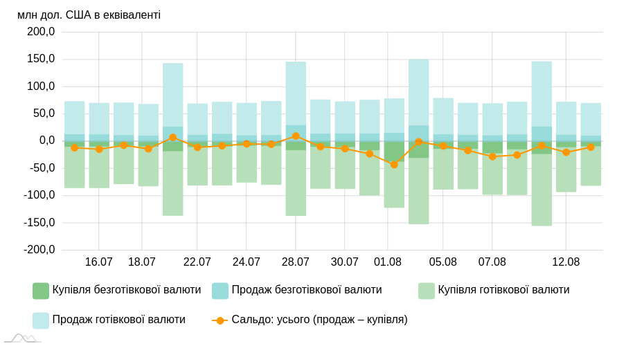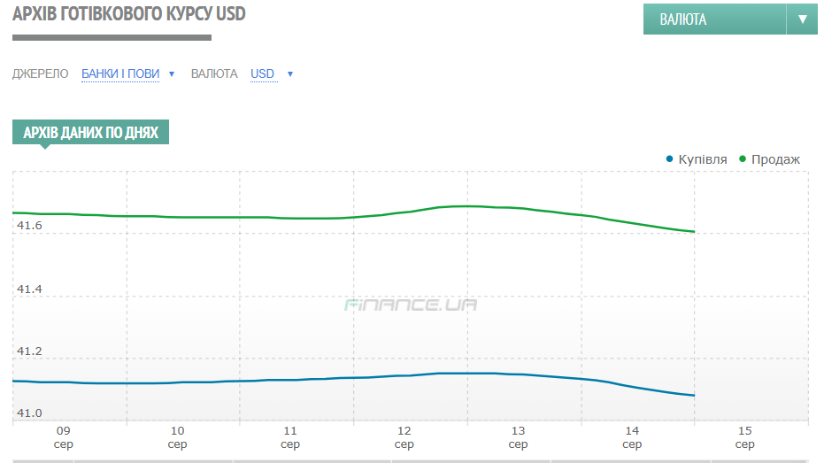 За 11−15 серпня курс продажу безготівкового долара на торгах просів на 20 копійок — з 41,41/41,44 до 41,21/41,24 гривень. Готівковий долар увечері п'ятниці 15 серпня в обмінниках фінкомпаній та в касах банків продавався по 41,45−41,65 гривень. І жодного ажіотажу не було.