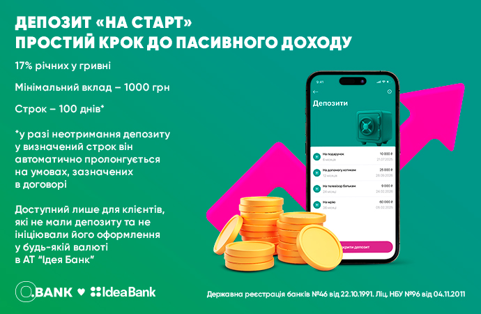 Більші відсотки можна отримати й в Ідея Банку. Зараз банк пропонує найвищу серед великих банків дохідність на річні вклади — 17% річних. Але якщо оформити такий строковий вклад через застосунок O.Bank, можна отримати ще 0,5% до ставки.