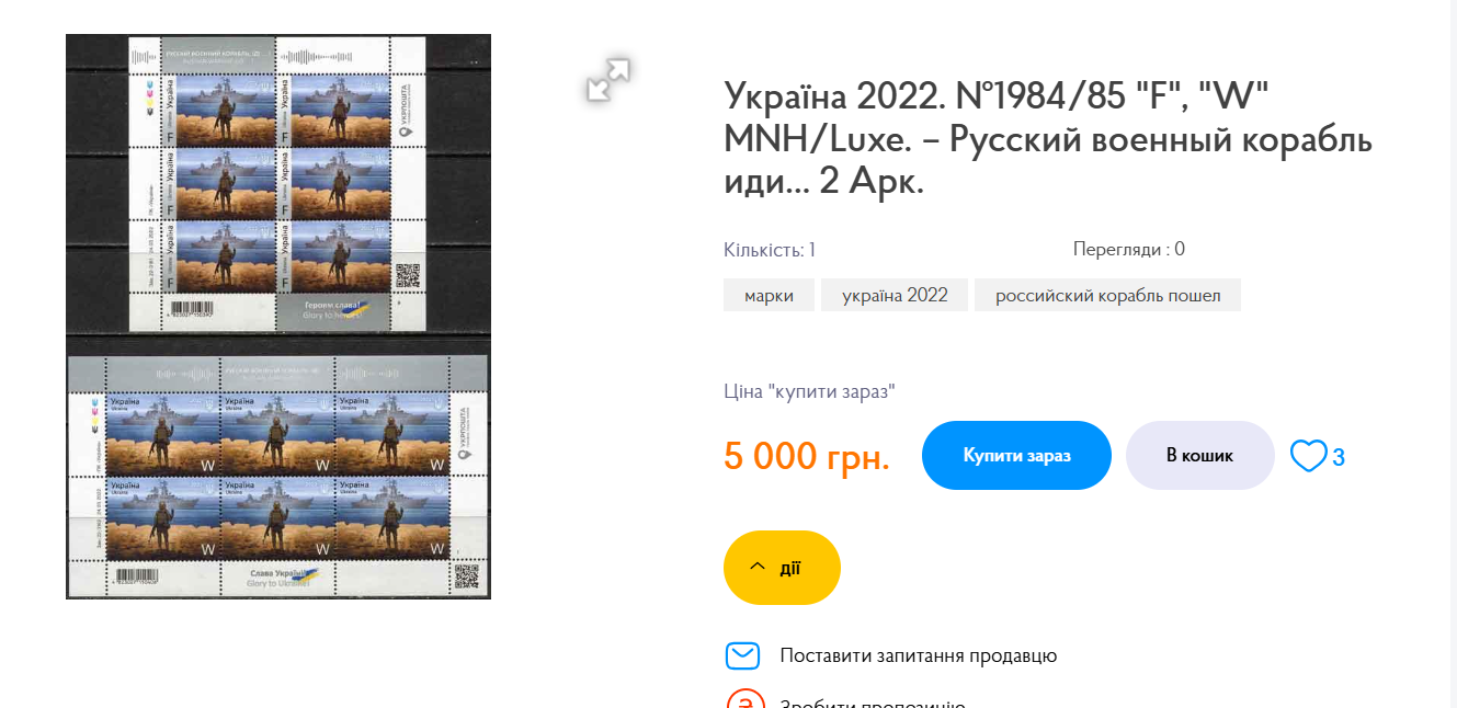 Марка виявилася пророчою, і вже 23 травня Укрпошта випустила її продовження «Російський воєнний корабель… Все». На піку ажіотажу вартість квітневого випуску «Російський воєнний корабель іди…» у колекціонерів доходила до 10 000−12 000 гривень і більше, за первісної вартості 2-х листів на Укрпошті — близько 500 гривень.