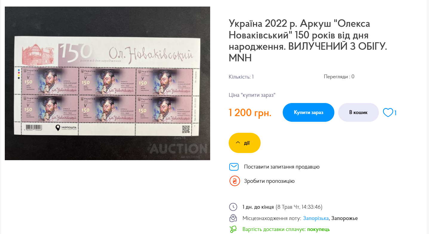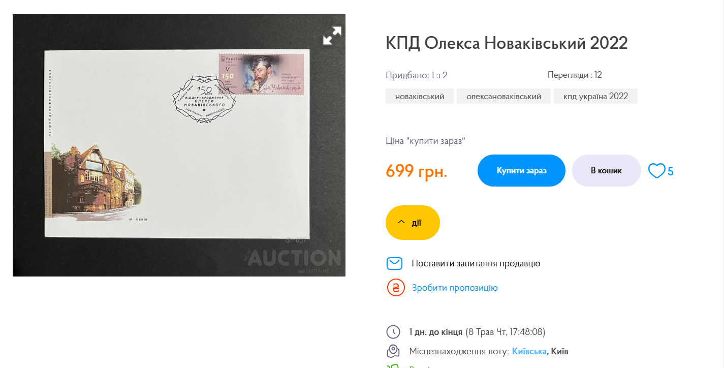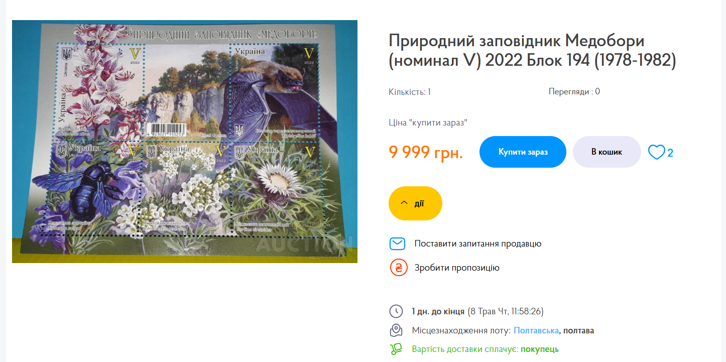 Наразі ця позиція серед колекціонерів є надзвичайно популярною і такий аркуш марок коштує на різних аукціонних майданчиках від 3 500 гривень до 4 600 гривень і навіть вище. А конверт першого дня (КПД) зі спецгасінням Київ — близько 1 500−1 600 гривень.