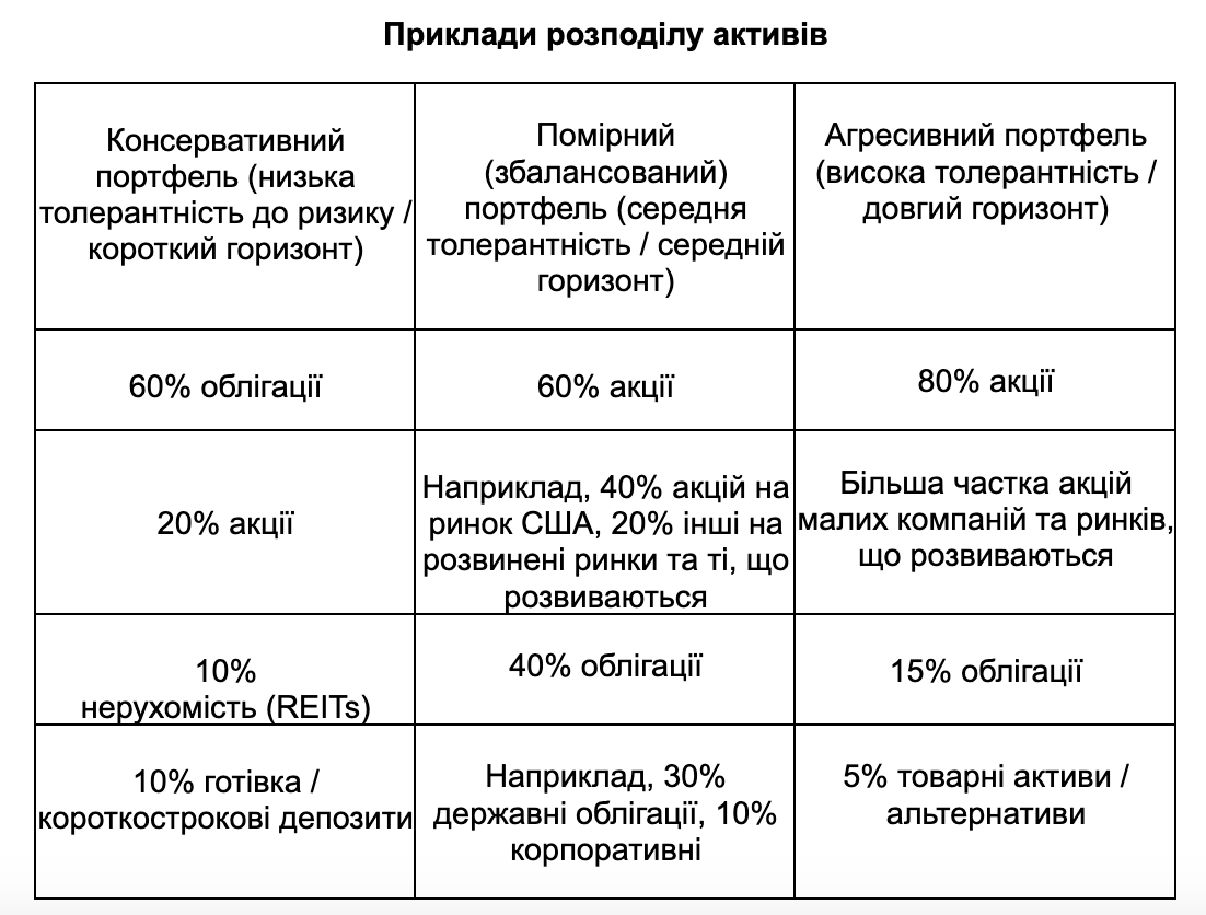 Унікальна роль кожного класу активів. Акції — для зростання, облігації — для стабільності, нерухомість та товари — для диверсифікації та захисту від інфляції.