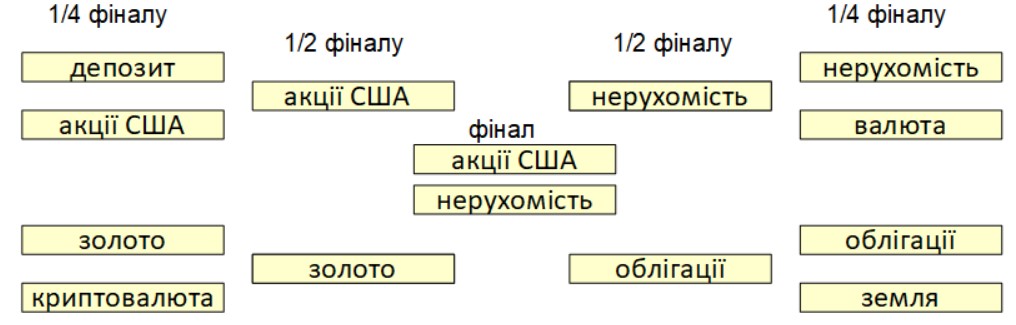 На шляху до фіналу нерухомість окрім облігацій подолала також готівкову валюту. У свою чергу американські акції обійшли спершу депозити, а в півфіналі у надзвичайно напруженій боротьбі перемогли золото.
