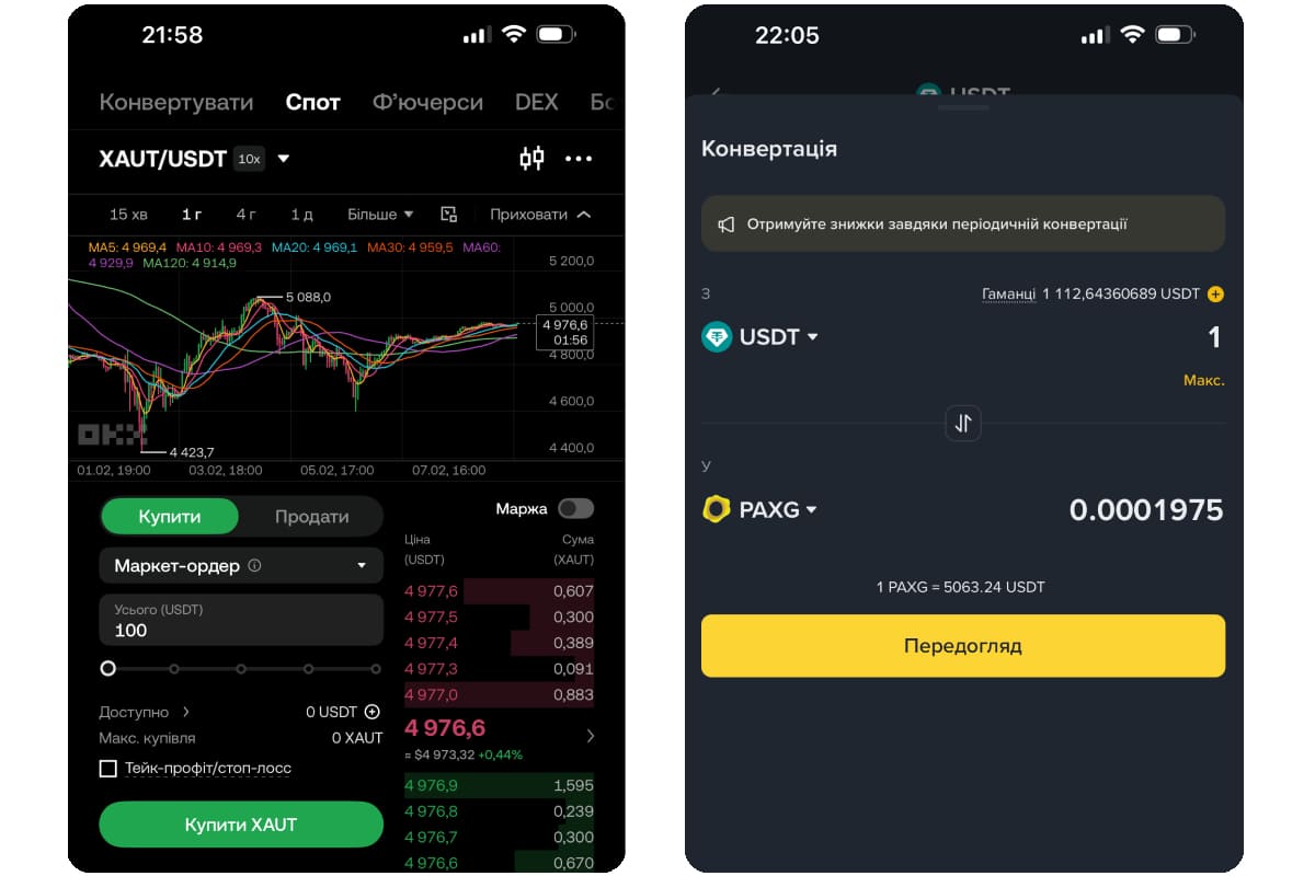 Друга перевага — швидкість і гнучкість. Щоби купити або продати PAXG чи XAUT, достатньо кількох кліків у застосунку: угода проходить швидко й без прив’язки до «робочих годин». Оскільки токени торгуються на криптоспоті, інвестор може заздалегідь виставити лімітні ордери — наприклад, купівлю нижче поточної ціни або продаж на заданому рівні — і частково автоматизувати операції без постійного контролю.