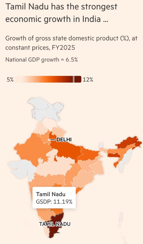 Подивіться на графіки — поки вся Індія зростає на 6,5%, економіка штату Сталіна злетіла на 11,2%. Дохід на душу населення у них 361 тисяча рупій (це близько $3 840) проти 208 тисяч (приблизно $2 210) в середньому по країні. Для розуміння контексту: ВВП на душу населення в Україні до початку повномасштабної війни (за даними Світового банку за 2021 рік) становив $4700. При цьому частка виробництва у валовому регіональному продукті Таміл Наду становить 24%, хоча в середньому по Індії вона ледь дотягує до 17%.