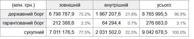 - за оцінками уряду, у 2026 році загальні витрати України на погашення та обслуговування державного боргу становитимуть близько 1,17−1,19 трлн грн із тенденцією до зростання до 1,29 трлн грн у 2028 році . У тому числі лише у 2026 році близько 656,82 млрд грн піде на погашення тіла боргу, а 513,12 млрд грн — на його обслуговування.