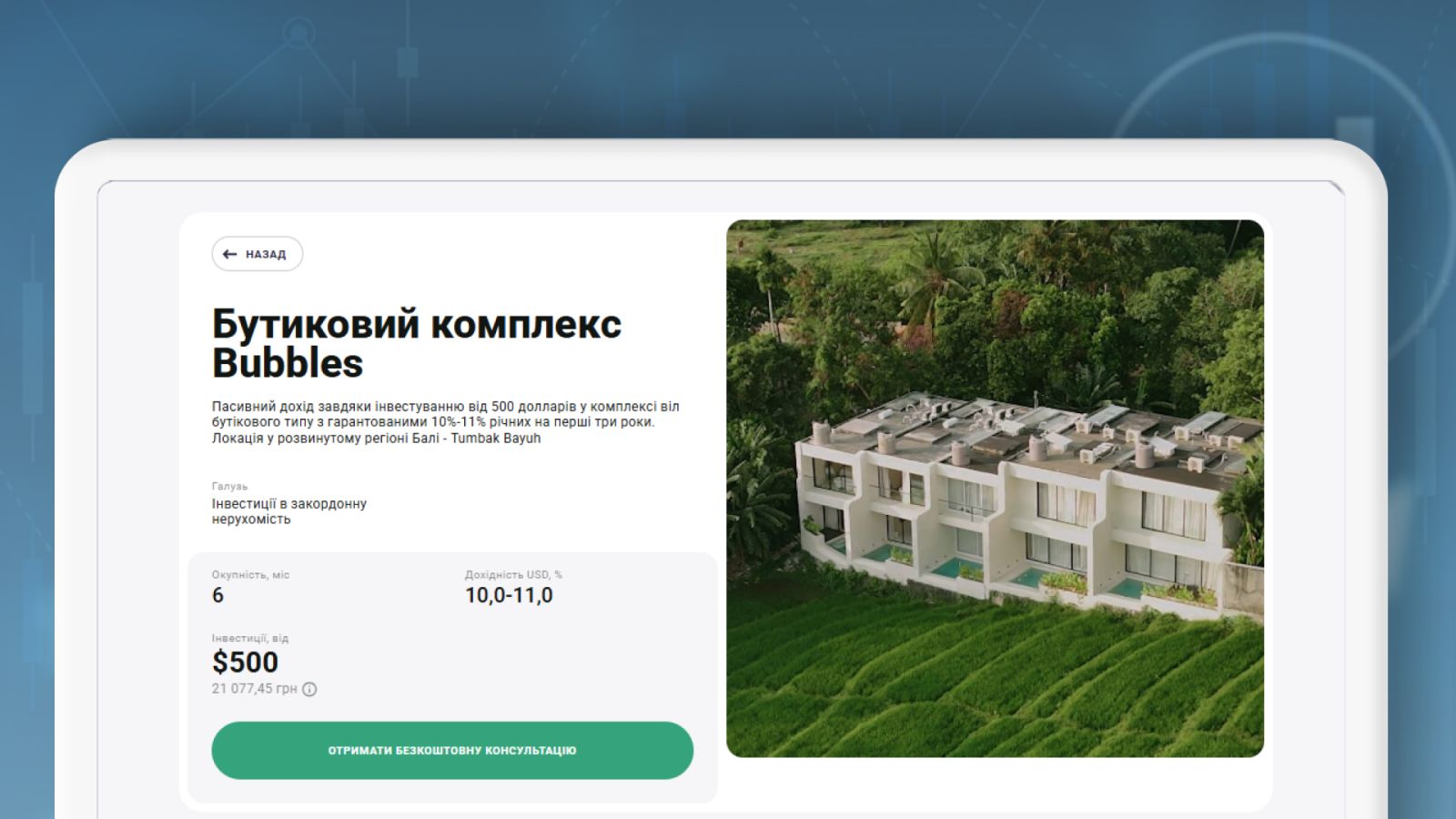 Проєкт Bubbles Complex пропонує інвесторам отримувати пасивний дохід від токенізованої нерухомісті на Балі. Це — інвестиції в нерухомість, але не в традиційному розумінні, а у форматі купівлі токенів. Тобто замість придбання цілої нерухомості, інвестор купує токени частки володіння.