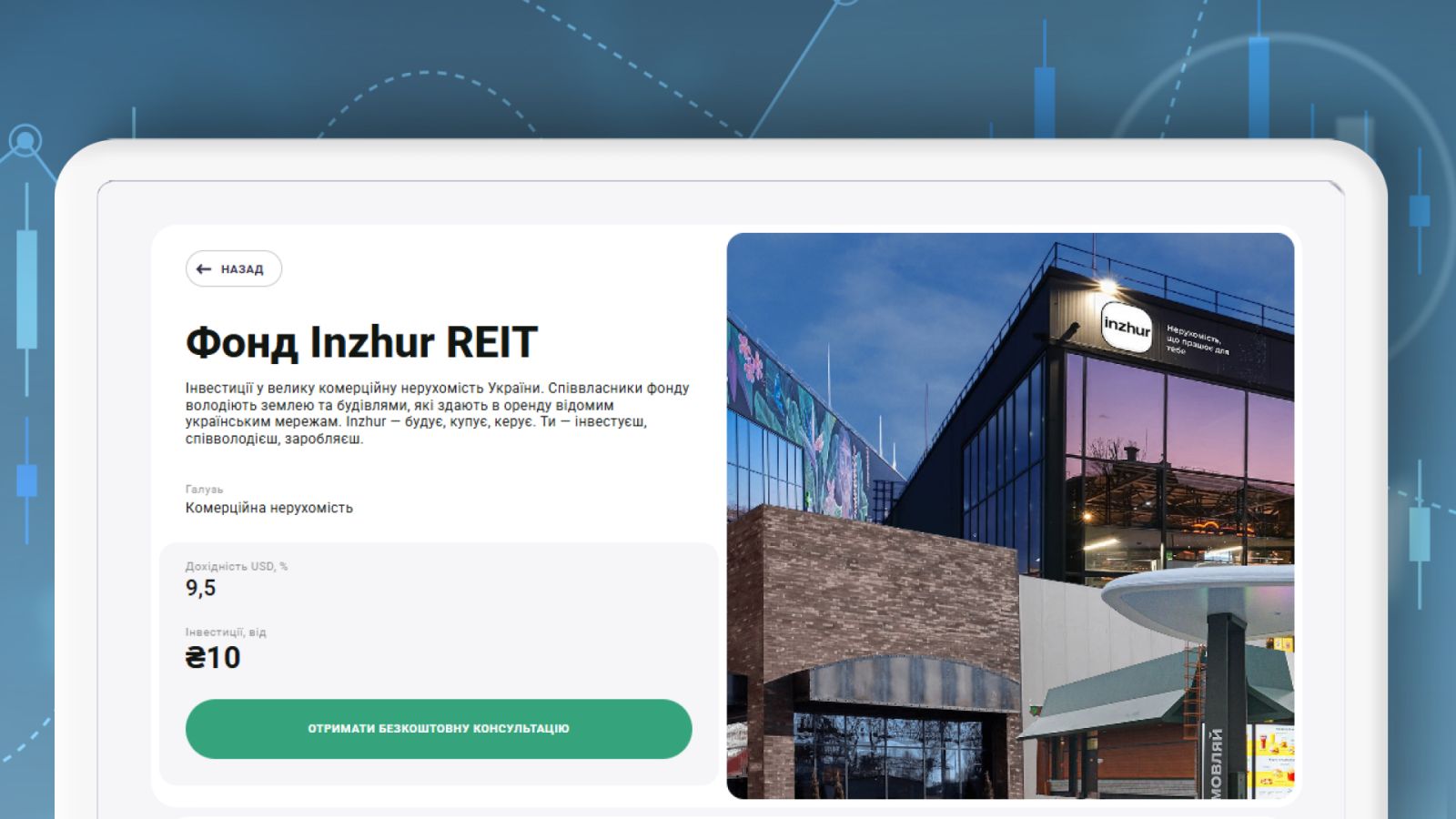 Інвестувати у нерухомість можна навіть з мінімальним стартовим капіталом. Фонд Inzhur REIT пропонує стати співвласником комерційної нерухомості лише від 10 грн (саме стільки коштує номінальна вартість одного сертифіката).
