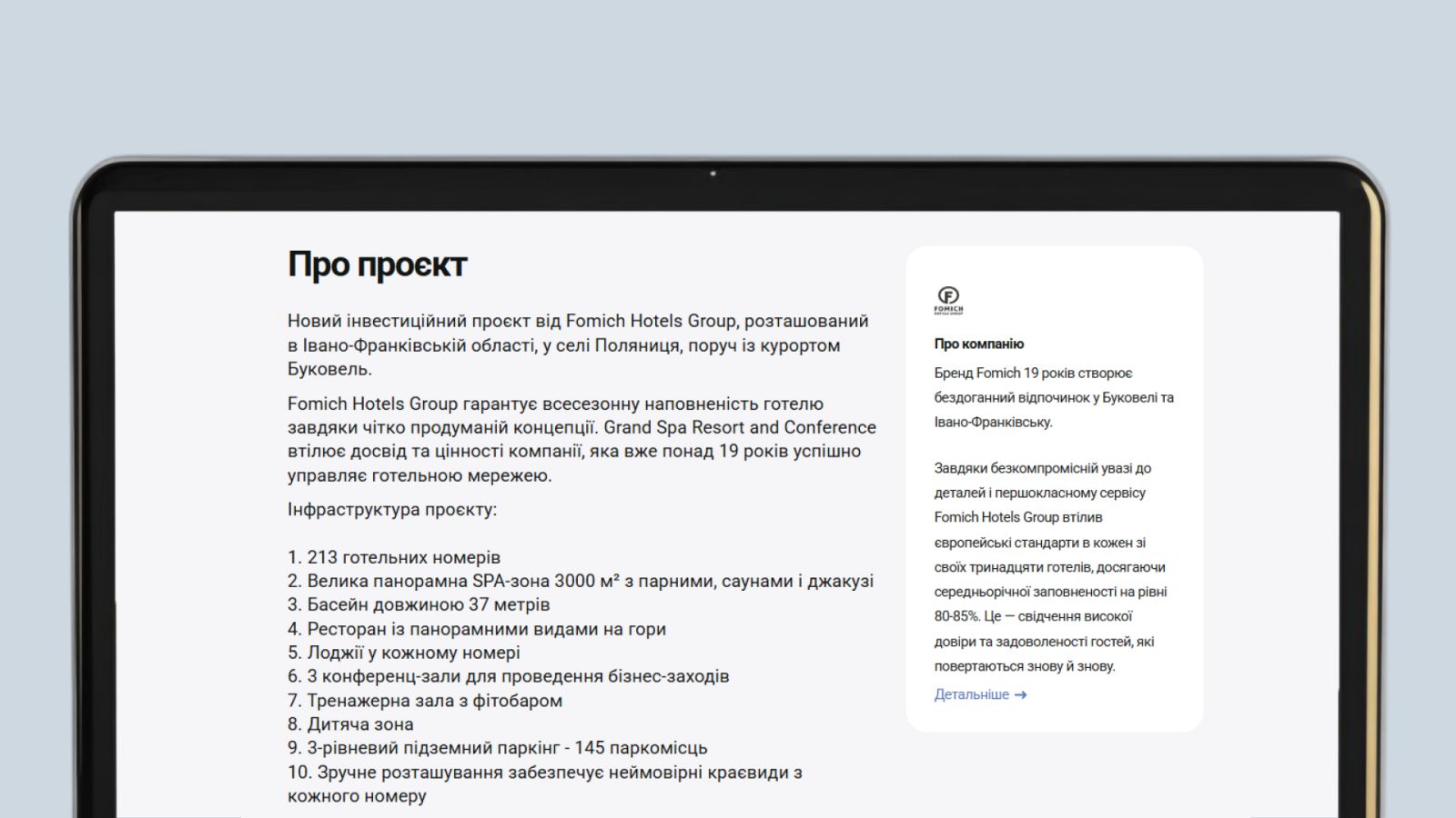 Наприклад, так виглядає опис Grand Spa Resort and Conference від Fomich Hotels Group: