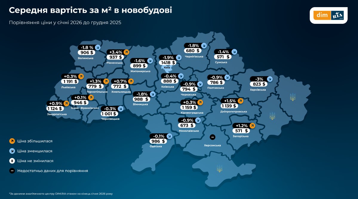 Вартість за квадратний метр у новобудовах відрізняється у залежності від регіону: динаміка коливань у порівнянні з попереднім місяцем — у межах 1−3% в середньому. Найбільше зростання ціни зафіксовано у Рівненській області — +3,4%. Київ залишається лідером за ціною: середня вартість квадратного метра у січні становила $1 418/м² (-1,9% у порівнянні з груднем 2025). Найбільше зменшення ціни за місяць спостерігається у Харківській області — падіння на 3%.