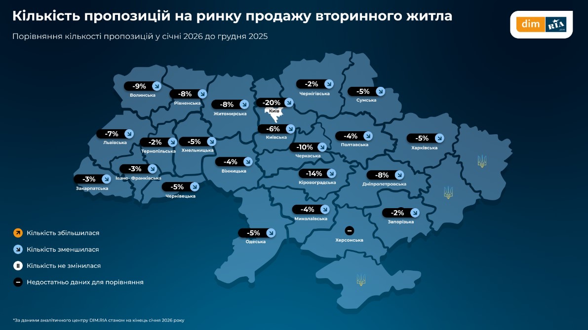 У січні кількість оголошень на вторинному ринку продовжила зменшуватись. Найбільше пропозиція впала у Києві (-20%), Кіровоградській (-14%) та Черкаській (-10%) областях.