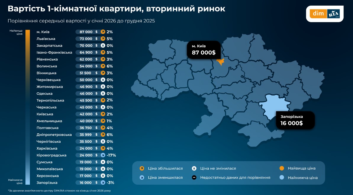 Вартість вторинного житла продовжує зростати в більшості областей України. Найбільші темпи зростання зафіксовано у Волинській (+6%), Дніпропетровській (+6%), Івано-Франківській (+5%) та Львівській (+5%) областях. Найнижча середня ціна за однокімнатну квартиру фіксується у Запорізькій області — $16 тис. Найдорожче житло у Києві: середня вартість у січні становить $87 тис.
