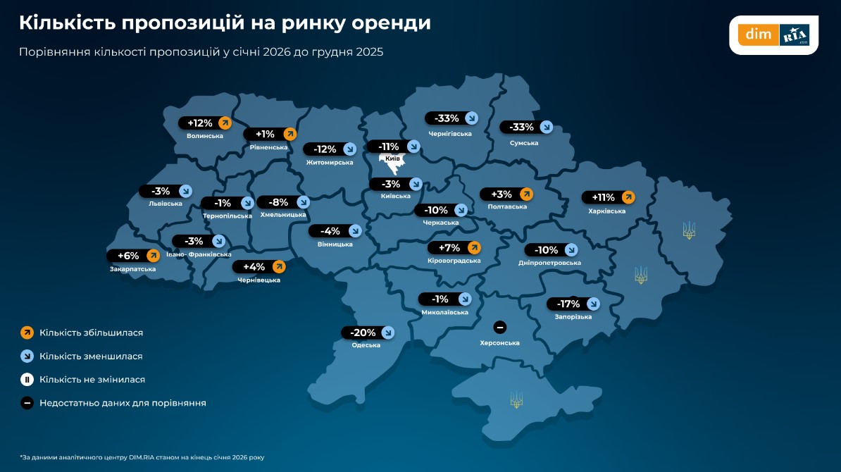 У січні кількість пропозицій у сегменті оренди здебільшого впала по країні. Найістотніше зменшення відбулось у Сумській (-33%), Чернігівській (-33%) та Одеській (-20%) областях. Найбільше зростання спостерігалось у Волинській (+12%) та Харківській (+11%) областях.