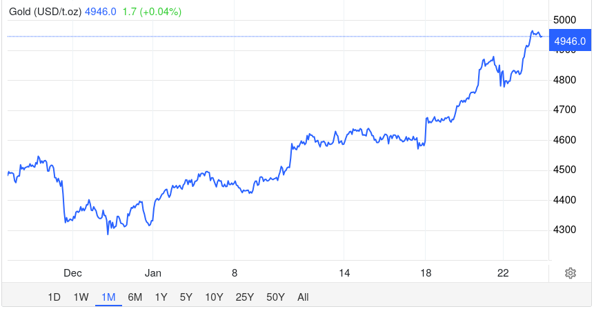 Котирування золота перетнули історичну позначку в 4950 доларів за унцію, встановивши новий рекорд. Дорогоцінний метал демонструє найкращу тижневу динаміку з березня 2020 року, що зумовлено збереженням геополітичної напруги та ослабленням американського долара. Станом на 23 січня 2026 року ціна зафіксувалася на рівні 4945,01 долара, показавши денний приріст у 0,19%. Про це повідомляє Trading Economics.