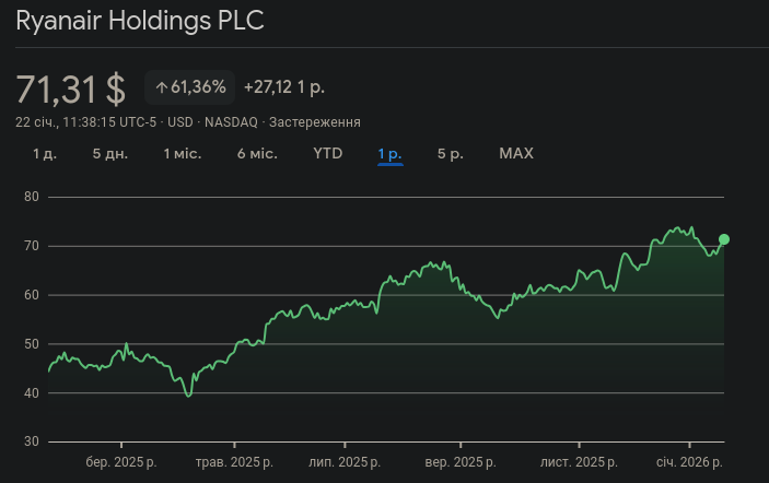 Попри медійний шум, інвестори голосують гаманцем. Аналіз динаміки акцій Ryanair (тікер RYAAY на Nasdaq) за рік демонструє, що ринок у захваті від фінансових результатів компанії.